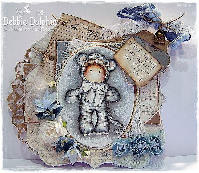 I used the Magnolia image I used for the transfer on my last post.( I didnt want to waste her) Ive since found out she is called 'Waterlily Tilda' ! gorgeous!! Ive given her a sepia look by watercolouring her in Walnut Ink.